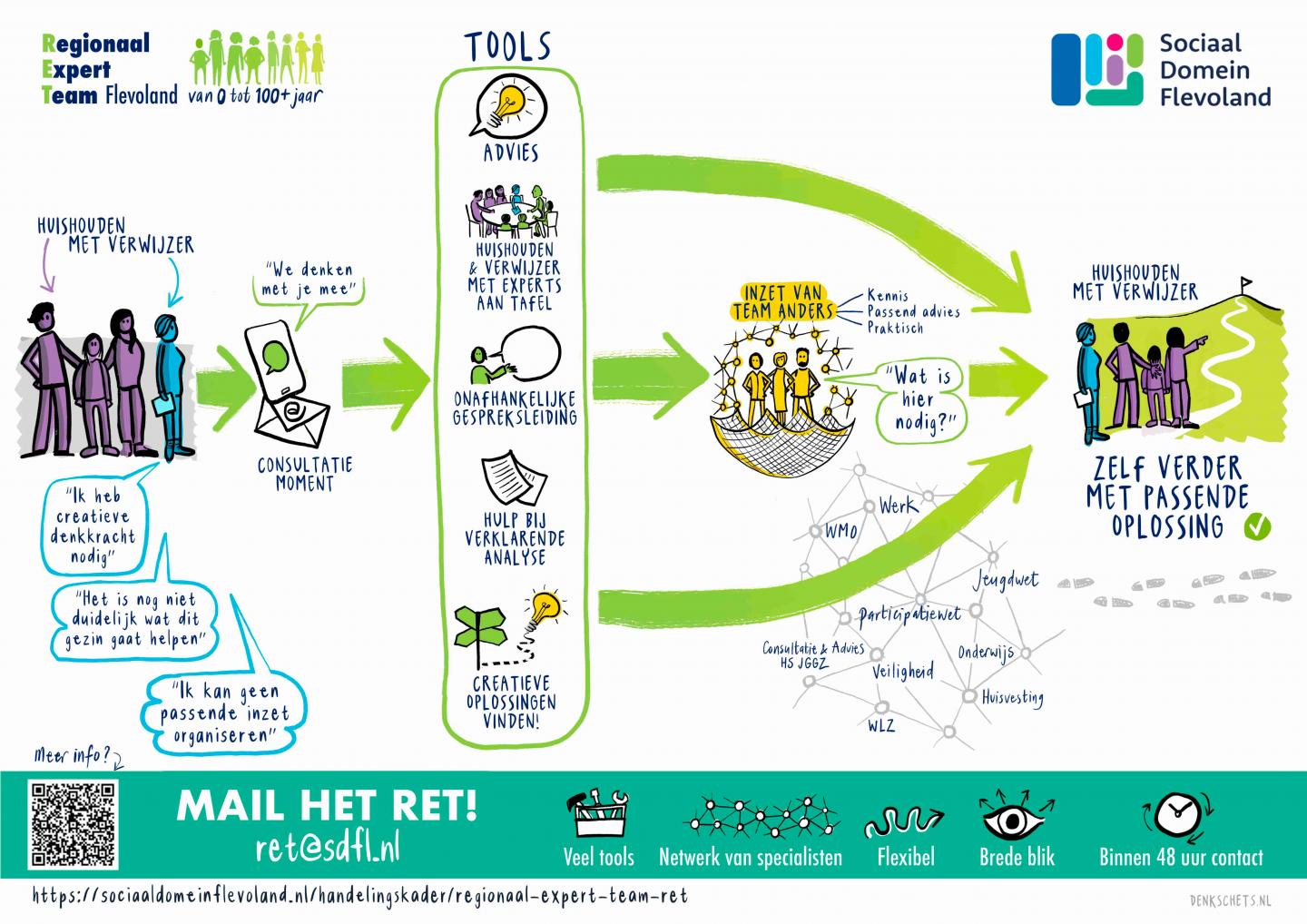 Het team bestaat uit medewerkers vanuit de lokale toegang, jeugdbescherming en aanbieders met een brede basis in de regio en werkt zo in nauwe samenwerking met stakeholders. Het RET is op werkdagen bereikbaar en reageert per e-mail altijd binnen twee werkdagen. Stuur een e-mail naar ret@sdfl.nl of neem contact op via het algemene telefoonnummer van RET: 088-1056810.